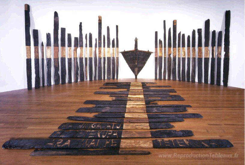 Nous vous proposons une reproduction artisanale sur toile du célèbre tableau 'Phoenix noir' de Ralph Hotere, provenant du Musée de la Reproduction.