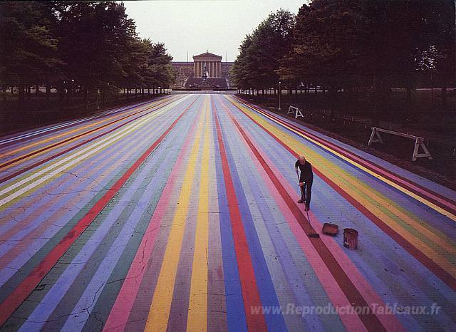 Nous vous proposons une reproduction artisanale sur toile du célèbre tableau 'Piste de sentier de Franklin' de Gene Davis, provenant du Musée de la Reproduction.
