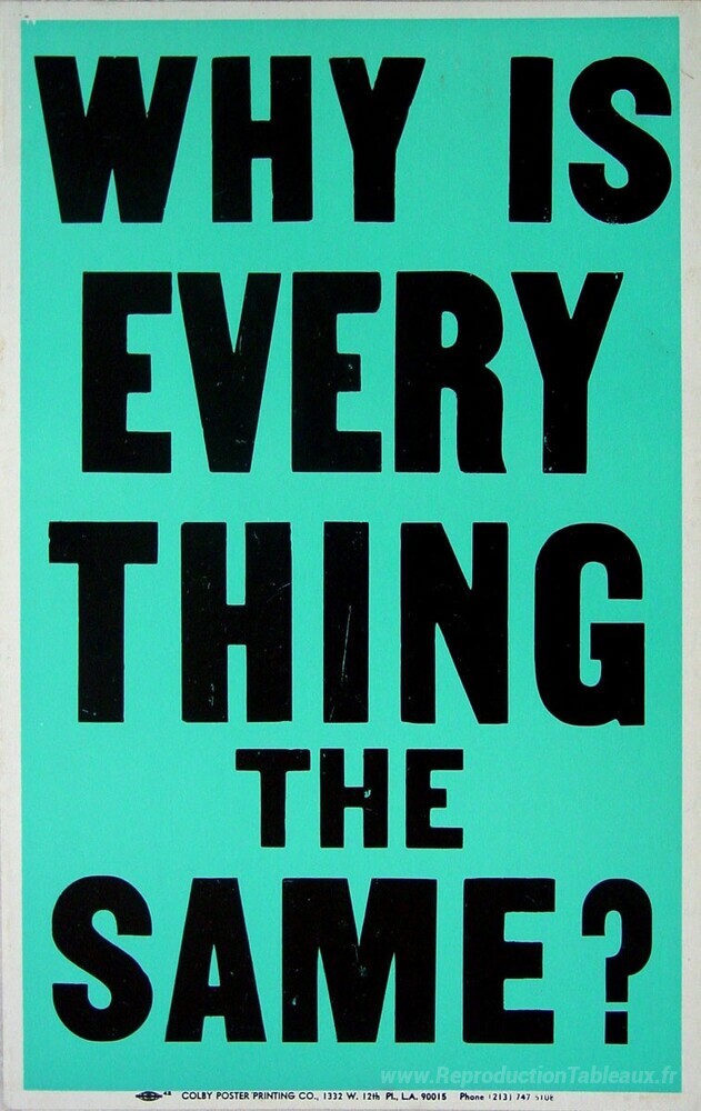 Nous vous proposons une reproduction artisanale sur toile du célèbre tableau 'Pourquoi tout est-il pareil? (Objets d'affiches)' de Allen Ruppersberg, provenant du Musée de la Reproduction.