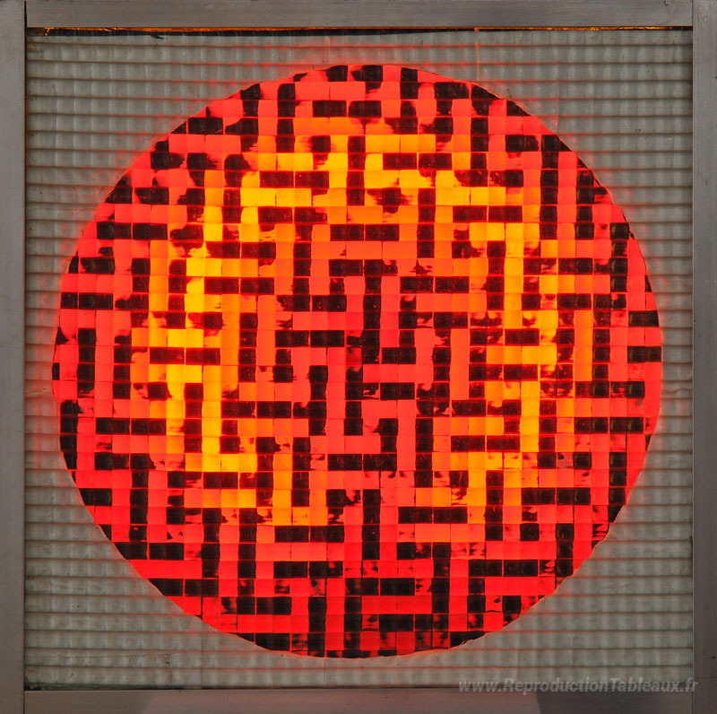 Nous vous proposons une reproduction artisanale sur toile du célèbre tableau 'Schéma Luminoso Variabile + Quadrionda 130' de Grazia Varisco, provenant du Musée de la Reproduction.