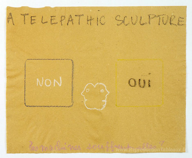 Nous vous proposons une reproduction artisanale sur toile du célèbre tableau 'Sculpture télépathique' de Robert Filliou, provenant du Musée de la Reproduction.