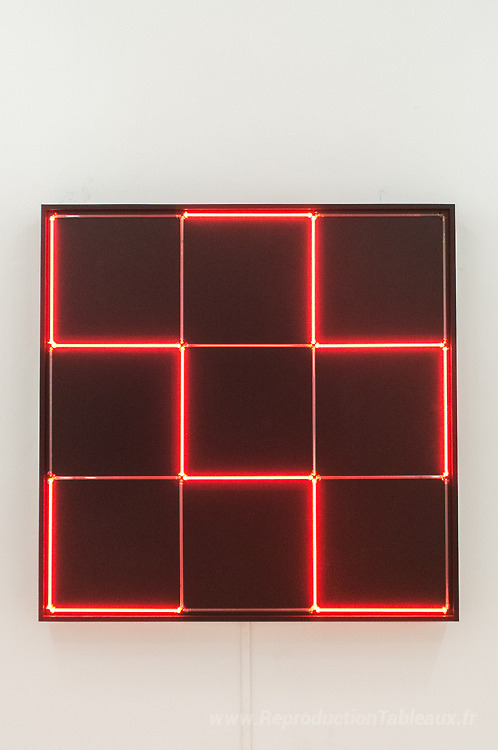 Nous vous proposons une reproduction artisanale sur toile du célèbre tableau 'Tirets Neon 0 ° -90 ° AVEC 4 RUTHMES INTERFÉRENTS' de Francois Morellet, provenant du Musée de la Reproduction.