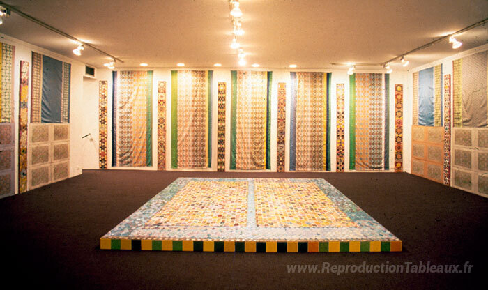 Nous vous proposons une reproduction artisanale sur toile du célèbre tableau 'Un intérieur décoré' de Joyce Kozloff, provenant du Musée de la Reproduction.
