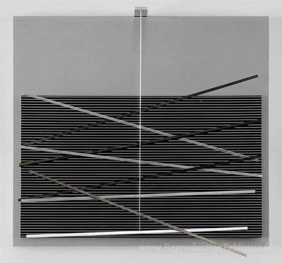 Nous vous proposons une reproduction artisanale sur toile du célèbre tableau 'Vibrazioni métalliques' de Jesus Rafael Soto, provenant du Musée de la Reproduction.