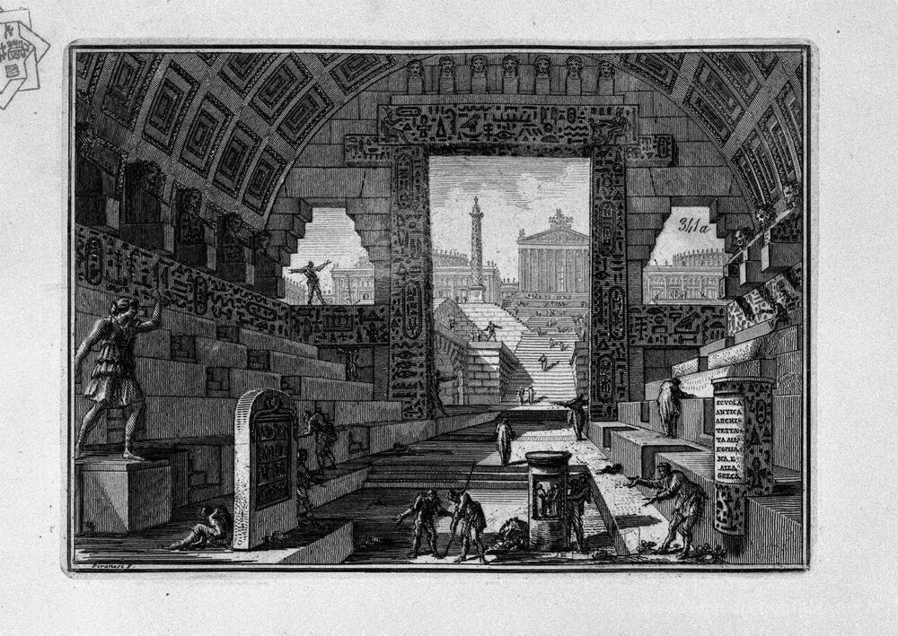 Nous vous proposons une reproduction artisanale sur toile du célèbre tableau 'École ancienne conçue par l'Égyptien et le grec' de Giovanni Battista Piranesi, provenant du Musée de la Reproduction.