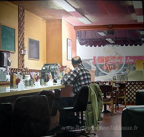 Nous vous proposons une reproduction artisanale sur toile du célèbre tableau 'Cafe de village' de Ralph Goings, provenant du Musée de la Reproduction.