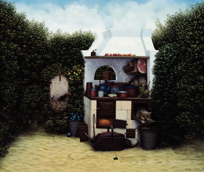 Nous vous proposons une reproduction artisanale sur toile du célèbre tableau 'Cuisine d'été' de Jacek Yerka, provenant du Musée de la Reproduction.