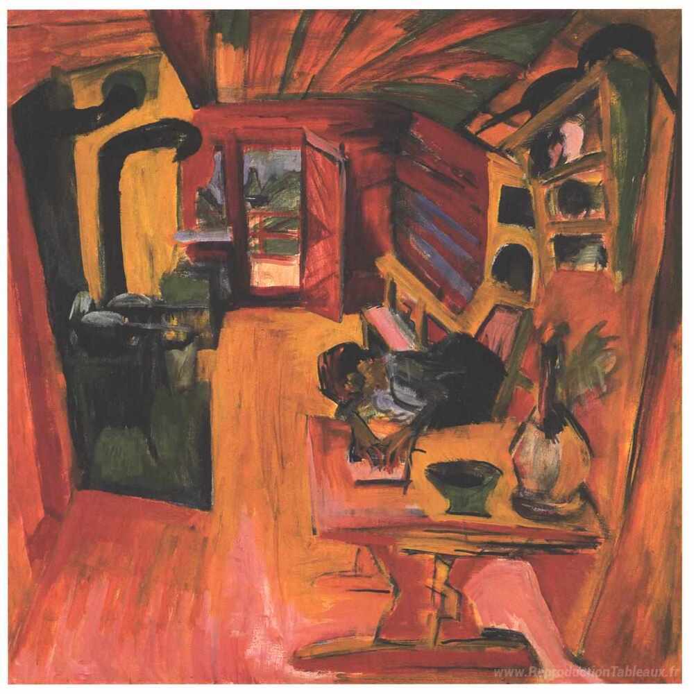 Nous vous proposons une reproduction artisanale sur toile du célèbre tableau 'Cuisine dans une cabane alpine' de Ernst Ludwig Kirchner, provenant du Musée de la Reproduction.