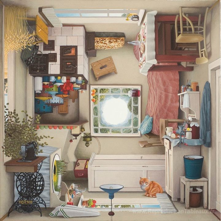Nous vous proposons une reproduction artisanale sur toile du célèbre tableau 'Cuisine polonaise' de Jacek Yerka, provenant du Musée de la Reproduction.