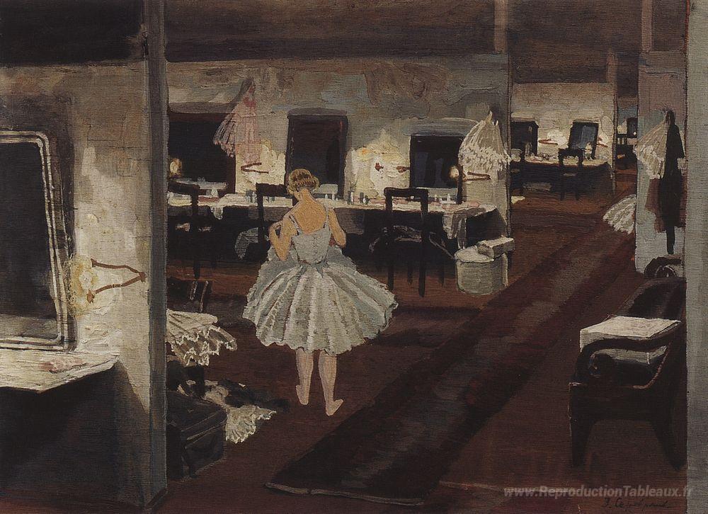 Nous vous proposons une reproduction artisanale sur toile du célèbre tableau 'Dans le vestiaire du ballet' de Zinaida Serebriakova, provenant du Musée de la Reproduction.