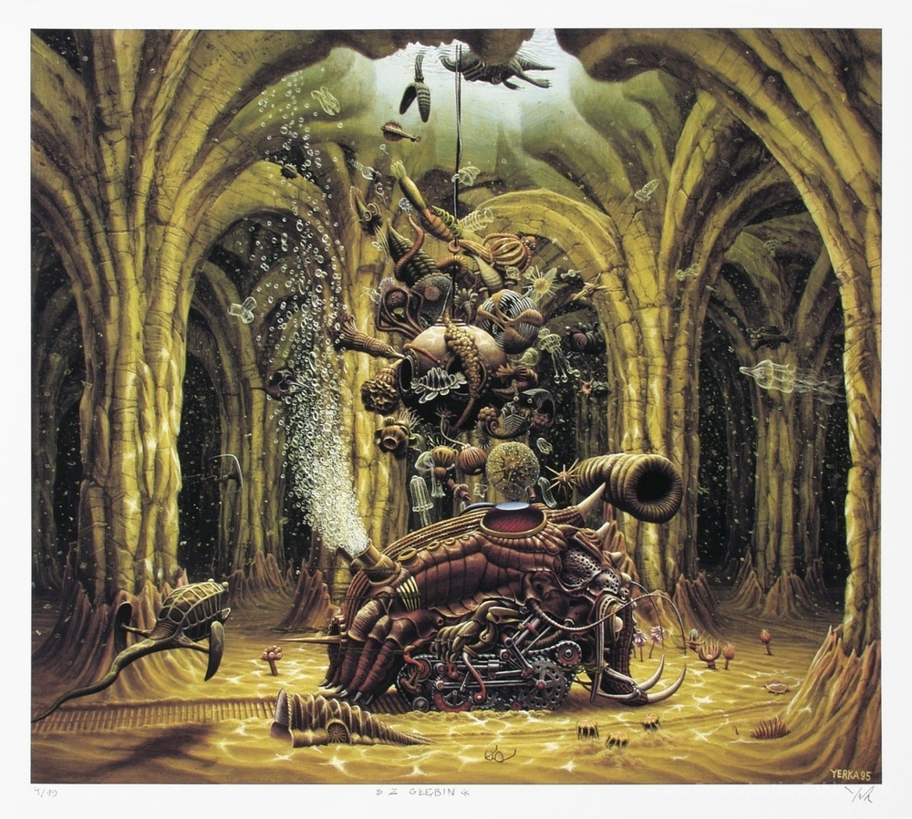 Nous vous proposons une reproduction artisanale sur toile du célèbre tableau 'Des profondeurs de' de Jacek Yerka, provenant du Musée de la Reproduction.