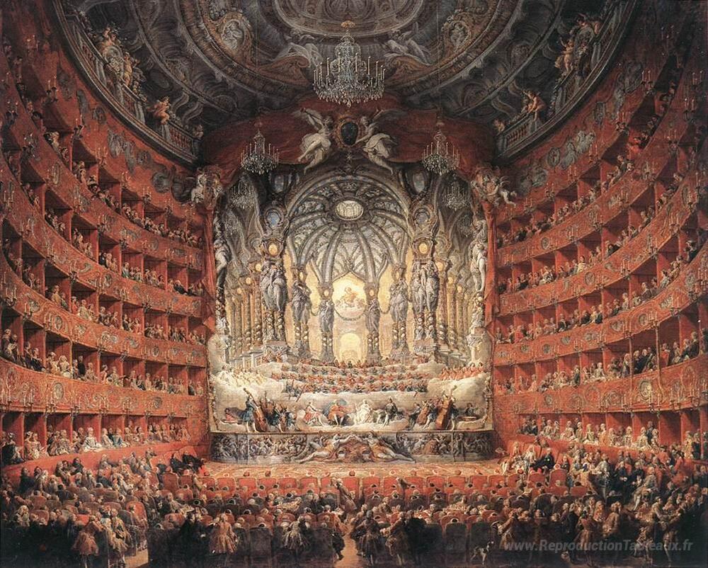 Nous vous proposons une reproduction artisanale sur toile du célèbre tableau 'Fête musicale' de Giovanni Paolo Panini, provenant du Musée de la Reproduction.