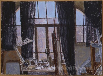 Nous vous proposons une reproduction artisanale sur toile du célèbre tableau 'Fenêtre de studio avec rideaux' de Avigdor Arikha, provenant du Musée de la Reproduction.
