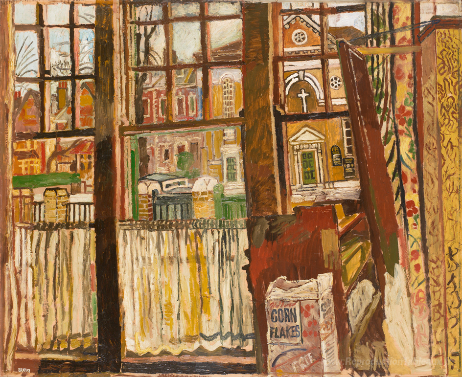 Nous vous proposons une reproduction artisanale sur toile du célèbre tableau 'Fenêtre, rangée Dartmouth, Blackheath' de John Bratby, provenant du Musée de la Reproduction.