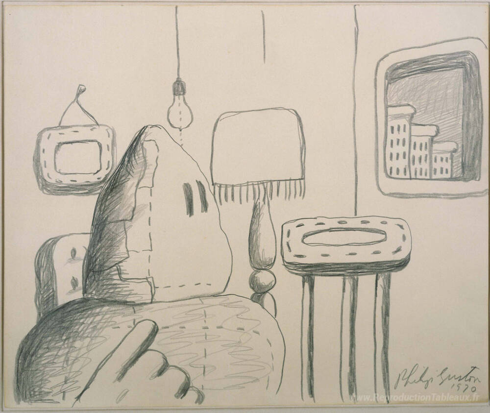 Nous vous proposons une reproduction artisanale sur toile du célèbre tableau 'Figure à l'intérieur' de Philip Guston, provenant du Musée de la Reproduction.