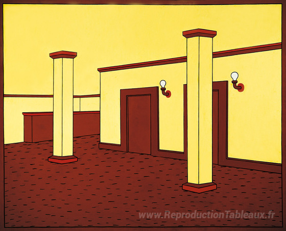 Nous vous proposons une reproduction artisanale sur toile du célèbre tableau 'Foyer (Bercy Theatre)' de Dale Hickey, provenant du Musée de la Reproduction.