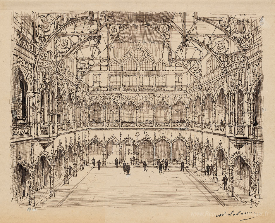 Nous vous proposons une reproduction artisanale sur toile du célèbre tableau 'Innenansicht der B?rse (Handelsbeurs) von Antwerpen' de Maxime Lalanne, provenant du Musée de la Reproduction.
