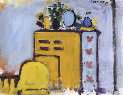 Nous vous proposons une reproduction artisanale sur toile du célèbre tableau 'Intérieur de studio' de Robert De Niro, Sr., provenant du Musée de la Reproduction.