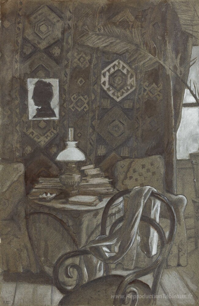 Nous vous proposons une reproduction artisanale sur toile du célèbre tableau 'Intérieur. Newport, Rhode Island.' de Mstislav Dobuzhinsky, provenant du Musée de la Reproduction.