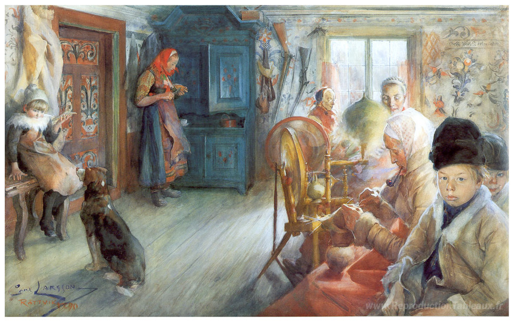 Nous vous proposons une reproduction artisanale sur toile du célèbre tableau 'Intérieur paysan en hiver' de Carl Larsson, provenant du Musée de la Reproduction.