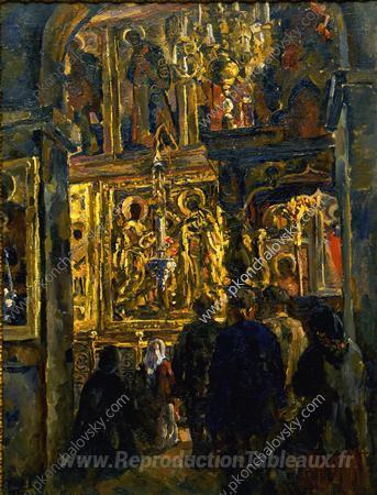 Nous vous proposons une reproduction artisanale sur toile du célèbre tableau 'Le service dans la cathédrale Saint-Sophia' de Pyotr Konchalovsky, provenant du Musée de la Reproduction.