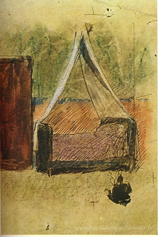 Nous vous proposons une reproduction artisanale sur toile du célèbre tableau 'Lit avec des moustiquaires' de Pablo Picasso, provenant du Musée de la Reproduction.