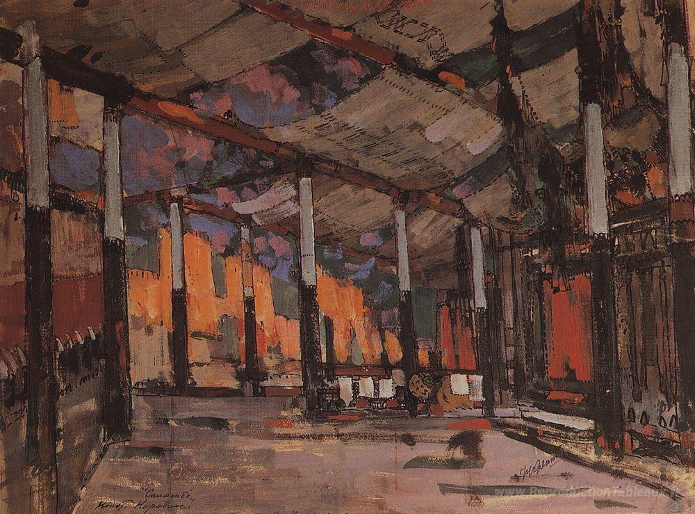 Nous vous proposons une reproduction artisanale sur toile du célèbre tableau 'Mato de tente militaire' de Konstantin Korovin, provenant du Musée de la Reproduction.