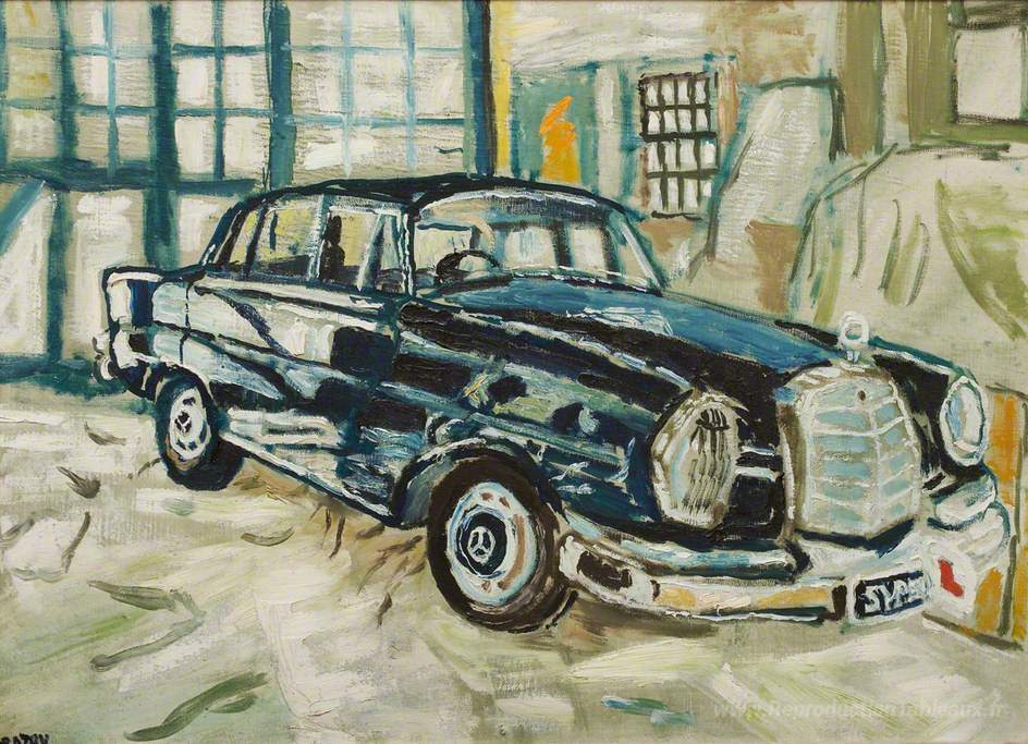 Nous vous proposons une reproduction artisanale sur toile du célèbre tableau 'Mercedes - la voiture de l'artiste' de John Bratby, provenant du Musée de la Reproduction.