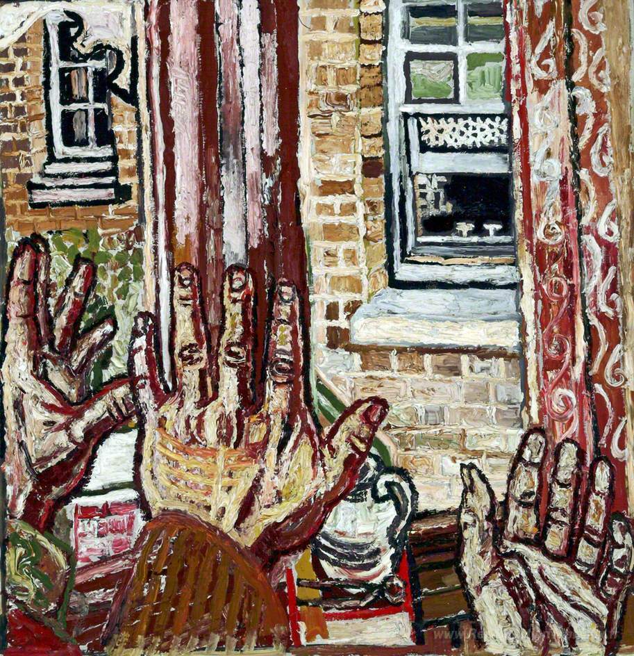 Nous vous proposons une reproduction artisanale sur toile du célèbre tableau 'Petite fenêtre avec les mains' de John Bratby, provenant du Musée de la Reproduction.
