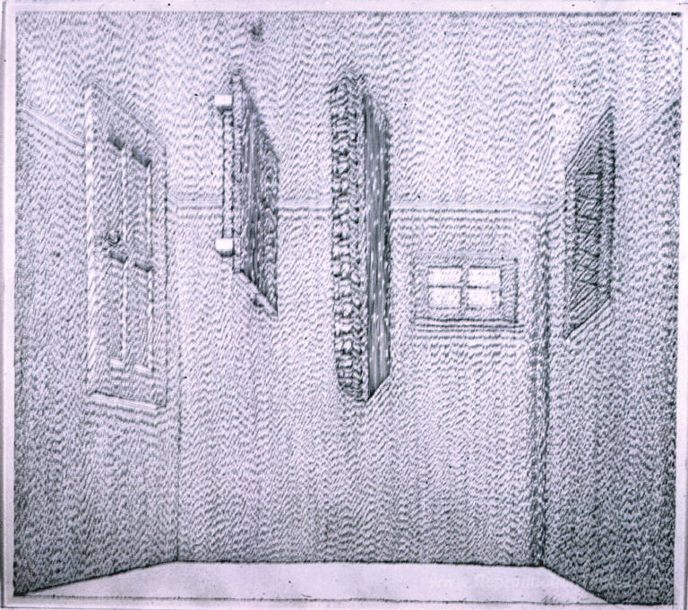 Nous vous proposons une reproduction artisanale sur toile du célèbre tableau 'Porte, miroir, table, panier, tapis, fenêtre' de Richard Artschwager, provenant du Musée de la Reproduction.