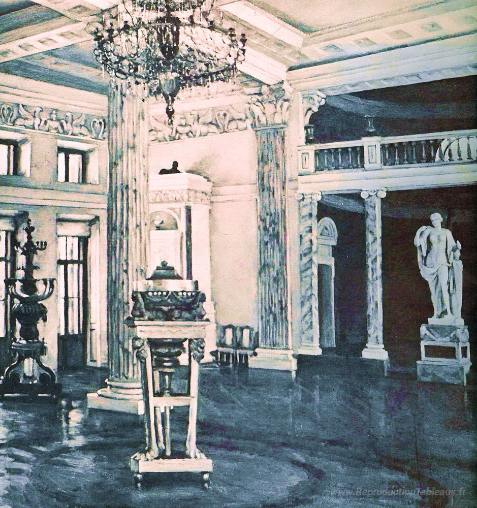 Nous vous proposons une reproduction artisanale sur toile du célèbre tableau 'Salle de concert du palais d'Ostankino' de Konstantin Yuon, provenant du Musée de la Reproduction.
