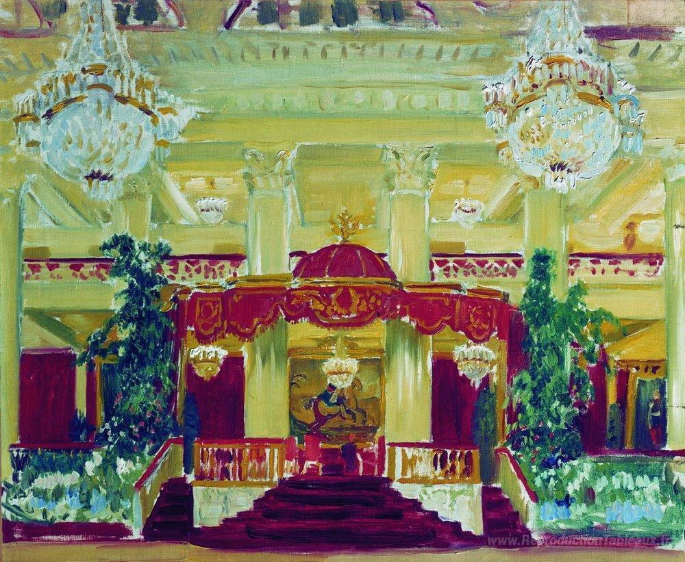 Nous vous proposons une reproduction artisanale sur toile du célèbre tableau 'Salle de l'assemblée de noblesse à Saint-Pétersbourg' de Boris Kustodiev, provenant du Musée de la Reproduction.