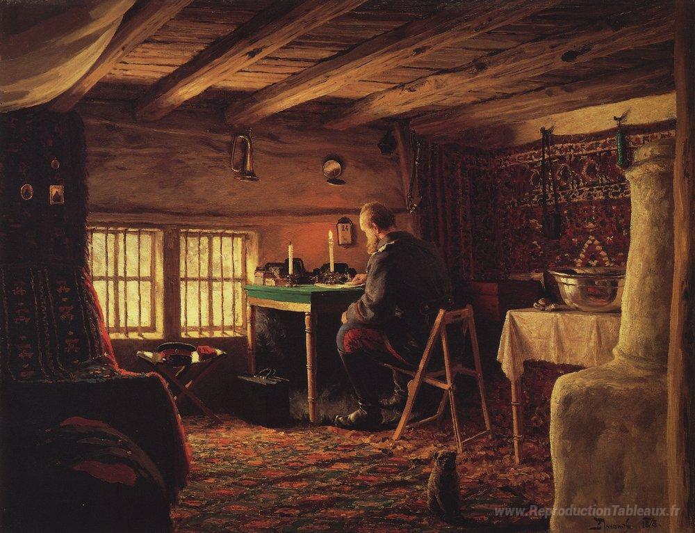 Nous vous proposons une reproduction artisanale sur toile du célèbre tableau 'Salle du commandant du détachement de Ruschuksk à Brestovets' de Vasily Polenov, provenant du Musée de la Reproduction.