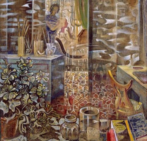 Nous vous proposons une reproduction artisanale sur toile du célèbre tableau 'Studio à Paris' de Nikos Hadjikyriakos-Ghikas, provenant du Musée de la Reproduction.