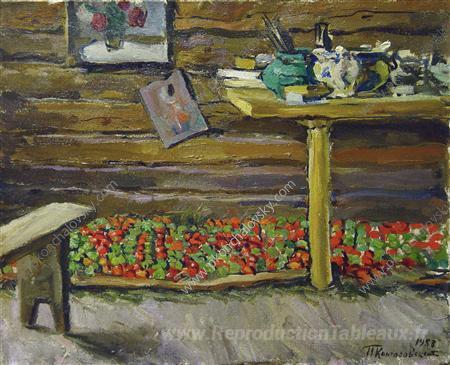 Nous vous proposons une reproduction artisanale sur toile du célèbre tableau 'Un atelier de travail. Tomates sur le banc.' de Pyotr Konchalovsky, provenant du Musée de la Reproduction.
