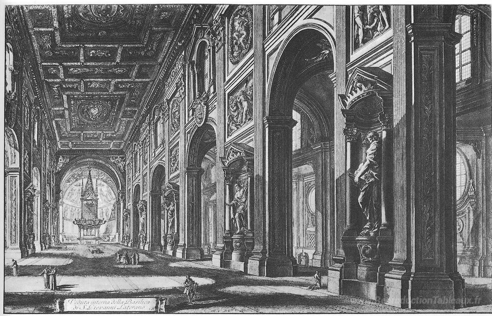 Nous vous proposons une reproduction artisanale sur toile du célèbre tableau 'Vedute di Roma' de Giovanni Battista Piranesi, provenant du Musée de la Reproduction.