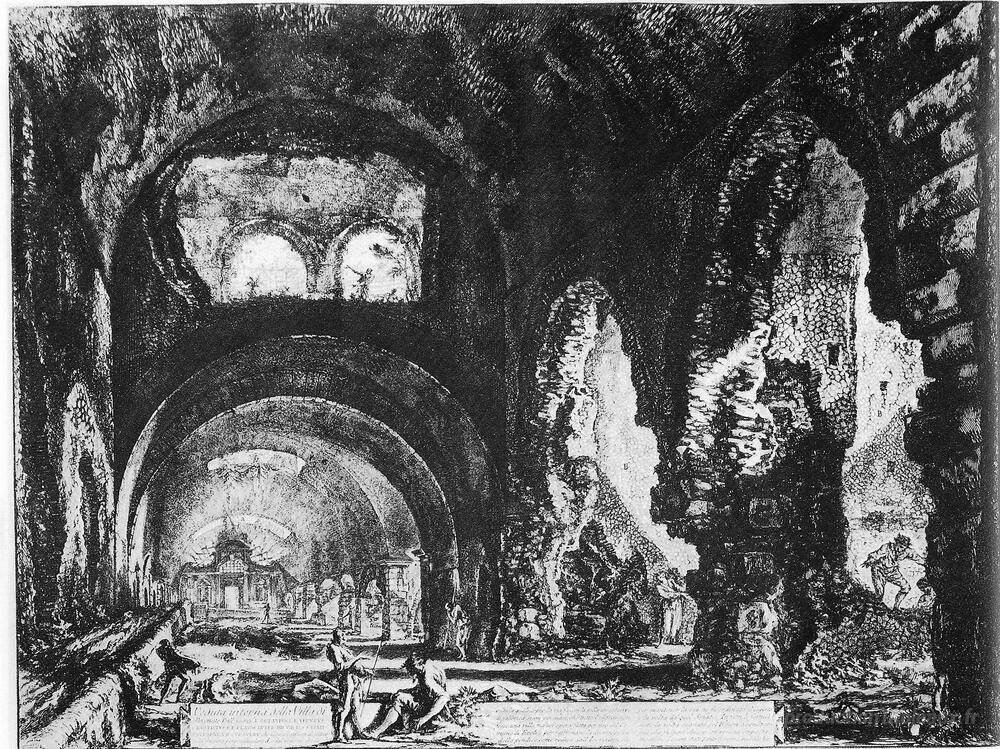 Nous vous proposons une reproduction artisanale sur toile du célèbre tableau 'Vedute di Roma' de Giovanni Battista Piranesi, provenant du Musée de la Reproduction.