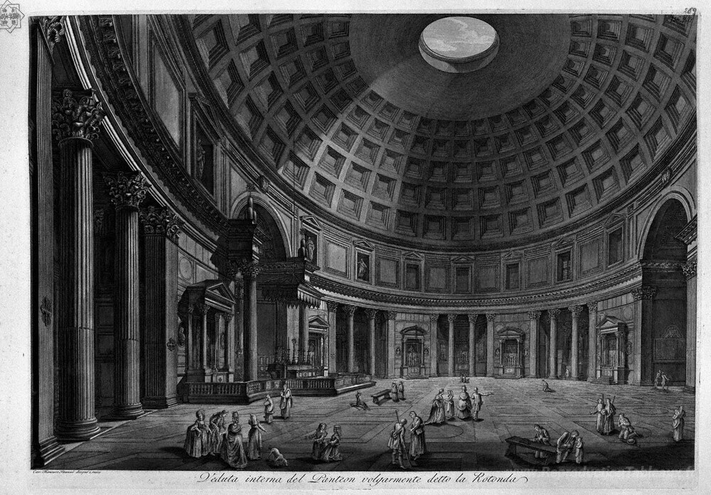 Nous vous proposons une reproduction artisanale sur toile du célèbre tableau 'Vue intérieure du panthéon communément appelé la rotonde' de Giovanni Battista Piranesi, provenant du Musée de la Reproduction.