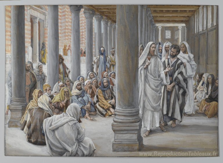 Nous vous proposons une reproduction artisanale sur toile du célèbre tableau 'Jésus marche dans le portique de Salomon (Jésus SE Promène dans ' de James Tissot, provenant du Musée de la Reproduction.