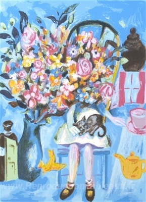 Nous vous proposons une reproduction artisanale sur toile du célèbre tableau 'Alice et fleurs' de Charles Blackman, provenant du Musée de la Reproduction.