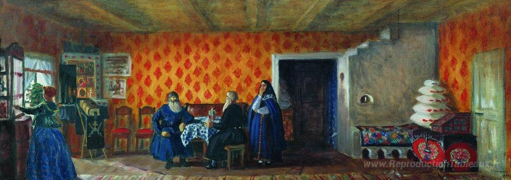 Nous vous proposons une reproduction artisanale sur toile du célèbre tableau 'Chambre de la maison de Prokofy Pazukhin' de Boris Kustodiev, provenant du Musée de la Reproduction.