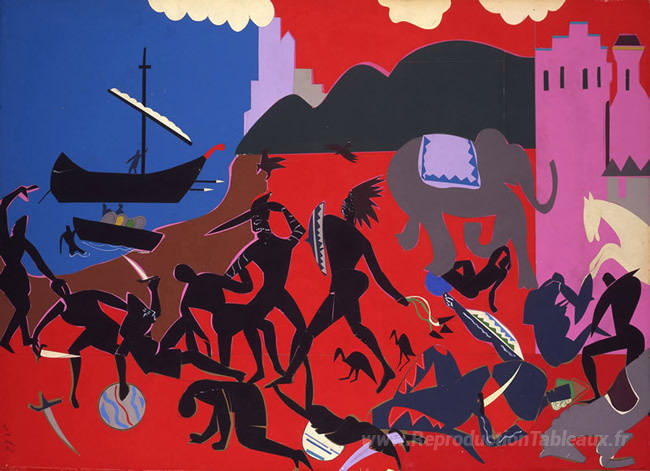 Nous vous proposons une reproduction artisanale sur toile du célèbre tableau 'Combattre avec Ciones' de Romare Bearden, provenant du Musée de la Reproduction.