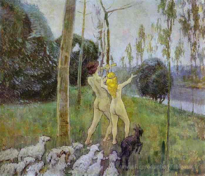 Nous vous proposons une reproduction artisanale sur toile du célèbre tableau 'Daphnis et Chloé' de Victor Borisov-Musatov, provenant du Musée de la Reproduction.