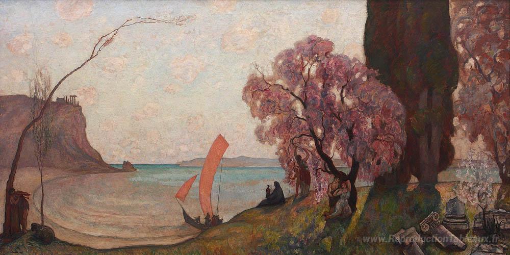 Nous vous proposons une reproduction artisanale sur toile du célèbre tableau 'Légende antique' de Samuel Mutzner, provenant du Musée de la Reproduction.
