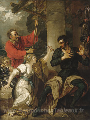Nous vous proposons une reproduction artisanale sur toile du célèbre tableau 'La demoiselle et Orlando' de Benjamin West, provenant du Musée de la Reproduction.
