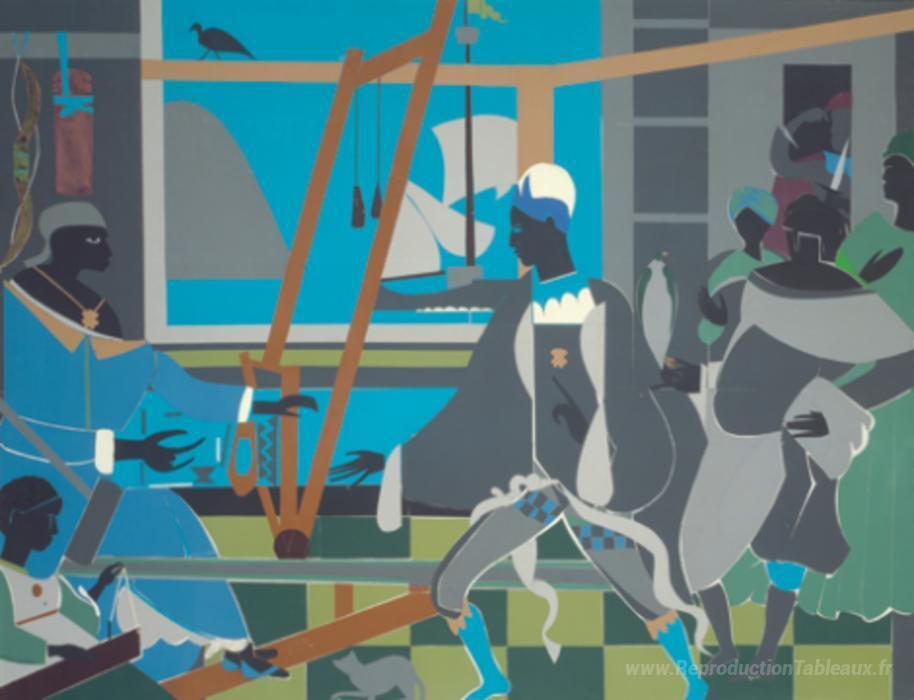 Nous vous proposons une reproduction artisanale sur toile du célèbre tableau 'Le retour d'Ulysse (hommage à Pintoricchio et au Bénin)' de Romare Bearden, provenant du Musée de la Reproduction.