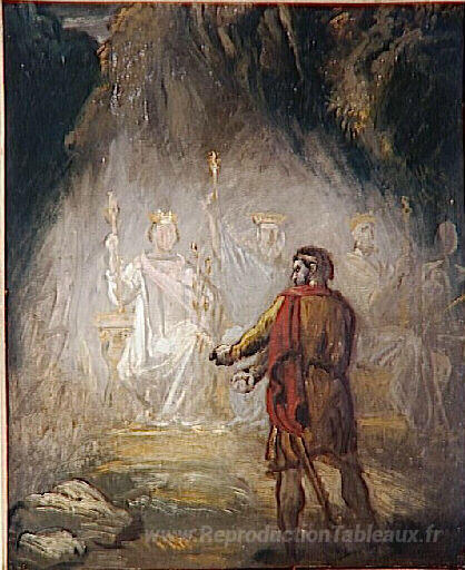 Nous vous proposons une reproduction artisanale sur toile du célèbre tableau 'Macbeth, l'apparition des rois' de Theodore Chasseriau, provenant du Musée de la Reproduction.