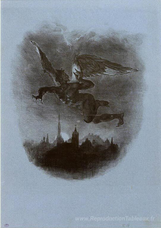 Nous vous proposons une reproduction artisanale sur toile du célèbre tableau 'Mephistopheles en l'air' de Eugene Delacroix, provenant du Musée de la Reproduction.
