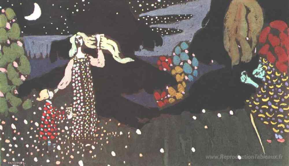 Nous vous proposons une reproduction artisanale sur toile du célèbre tableau 'Nuit' de Wassily Kandinsky, provenant du Musée de la Reproduction.