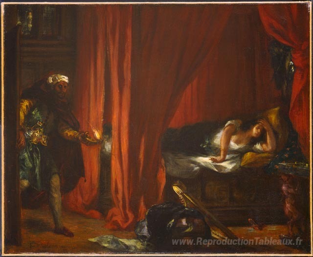 Nous vous proposons une reproduction artisanale sur toile du célèbre tableau 'Othello et Desdemona' de Eugene Delacroix, provenant du Musée de la Reproduction.